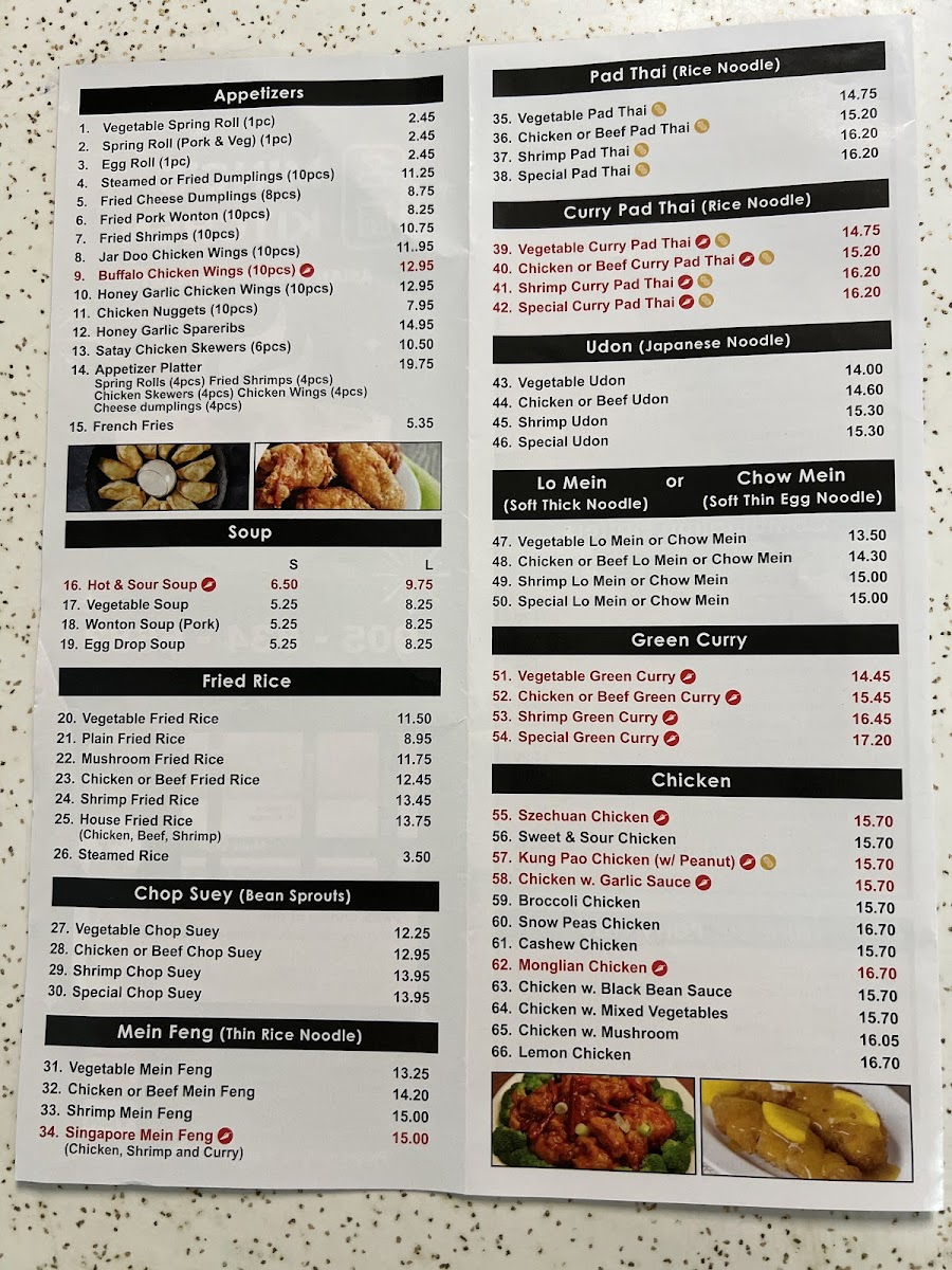 For those who enjoy bold, spicy flavors, the Green Curry options, such as Vegetable Green Curry, Chicken or Beef Green Curry, and Shrimp Green Curry, are highly recommended. The Chicken section also features crowd favorites like Szechuan Chicken, Sweet & Sour Chicken, and Kung Pao Chicken, each with its unique flavors that combine savory, tangy, and spicy notes.