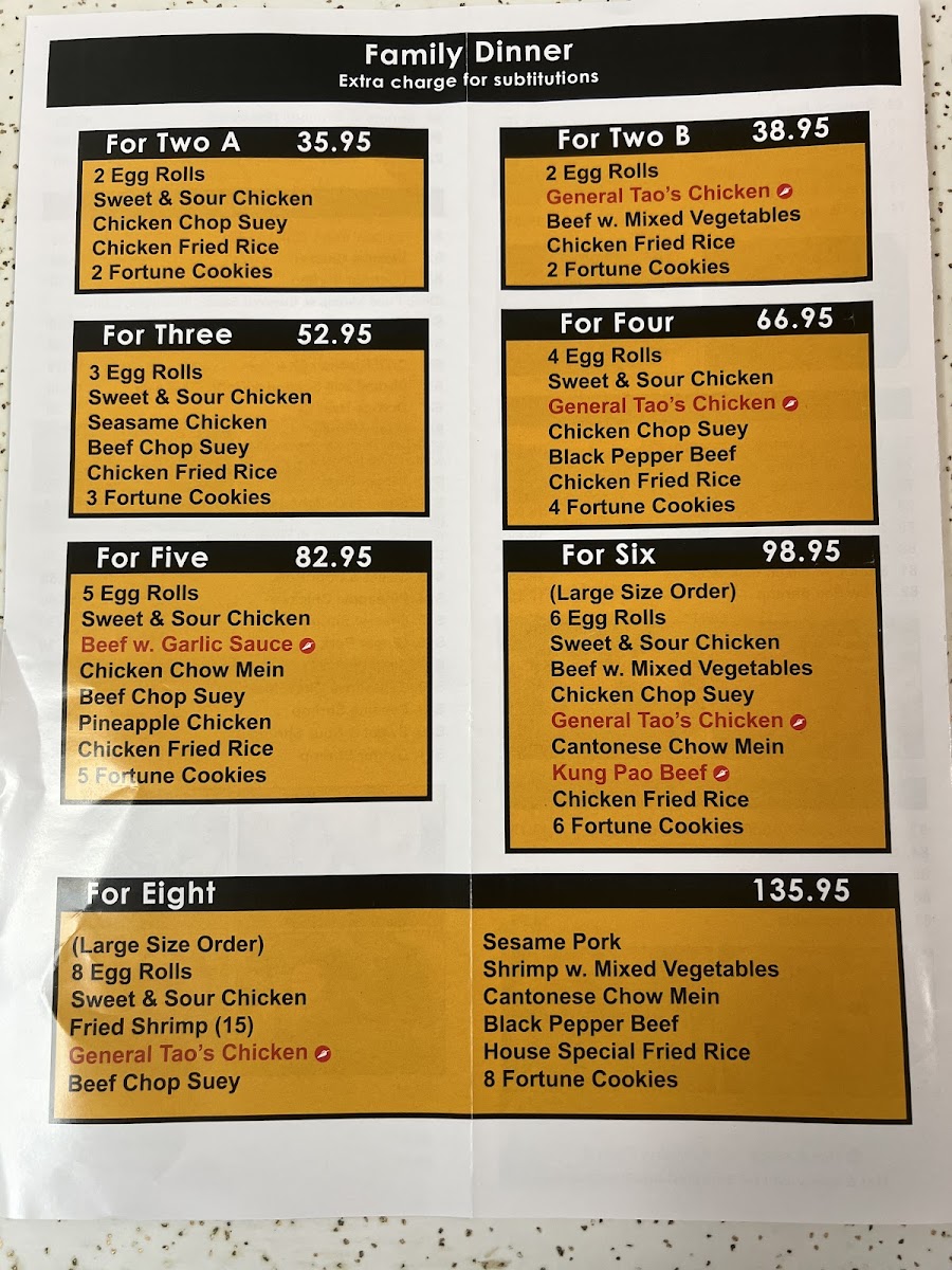 The restaurant also features combo platters for those wanting a variety of flavors. Choose from combinations like Sweet & Sour Chicken, Fried Shrimp, or General Tao's Chicken to enjoy a selection of dishes in one meal. The Take Out Party Tray is an excellent choice for larger gatherings, with options like Spring Rolls, Sesame Chicken, and Cantonese Chow Mein to feed a crowd.