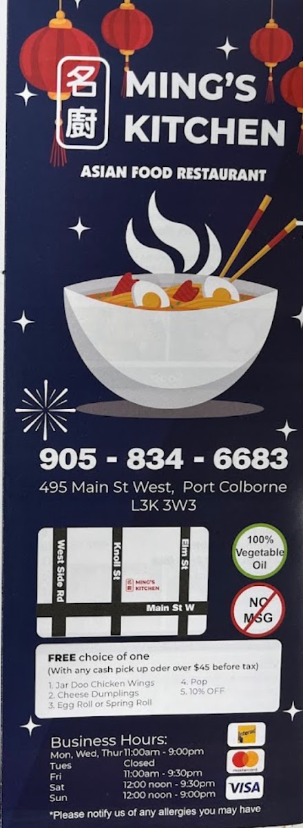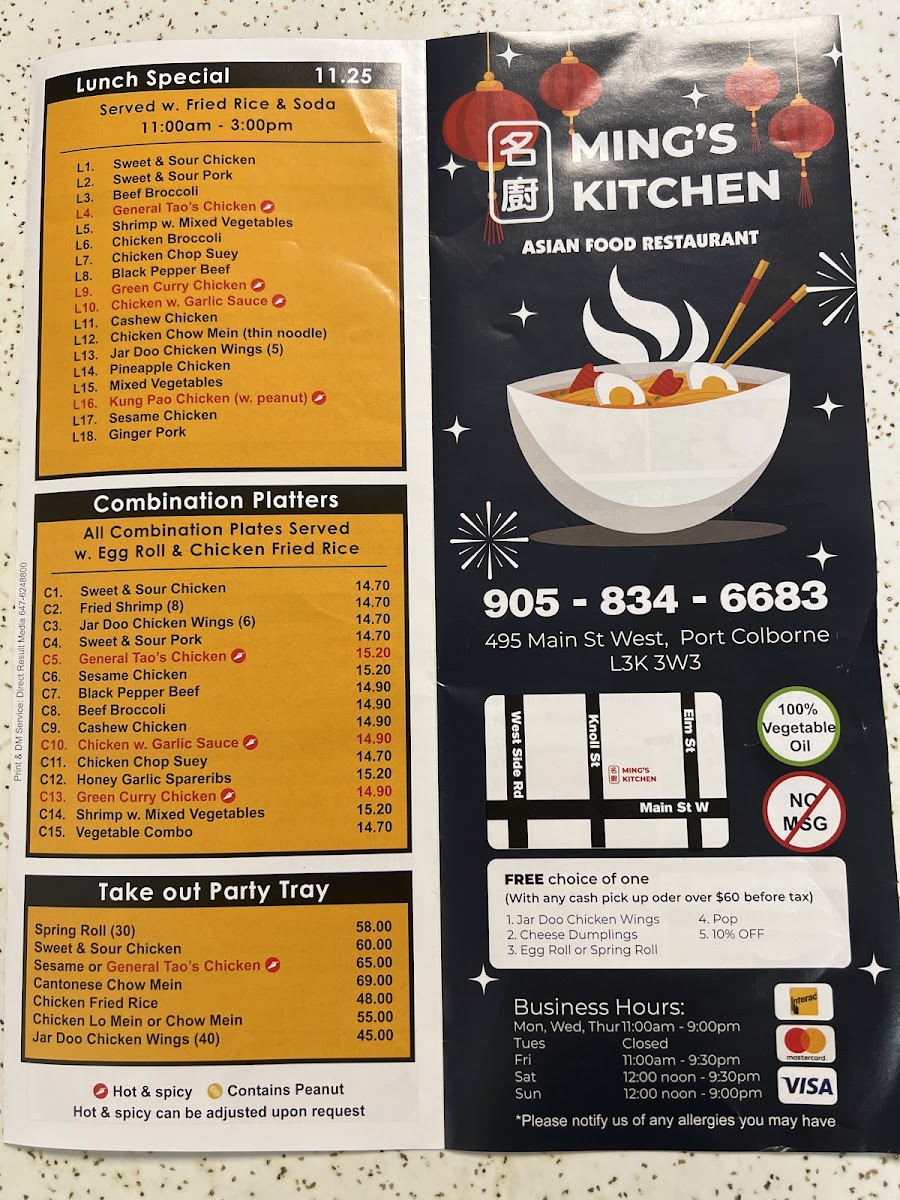 Overall, Ming's Kitchen at 495 Main St W in Port Colborne offers a vibrant menu with both classic and unique dishes, catering to all kinds of cravings with affordable and flavorful options.